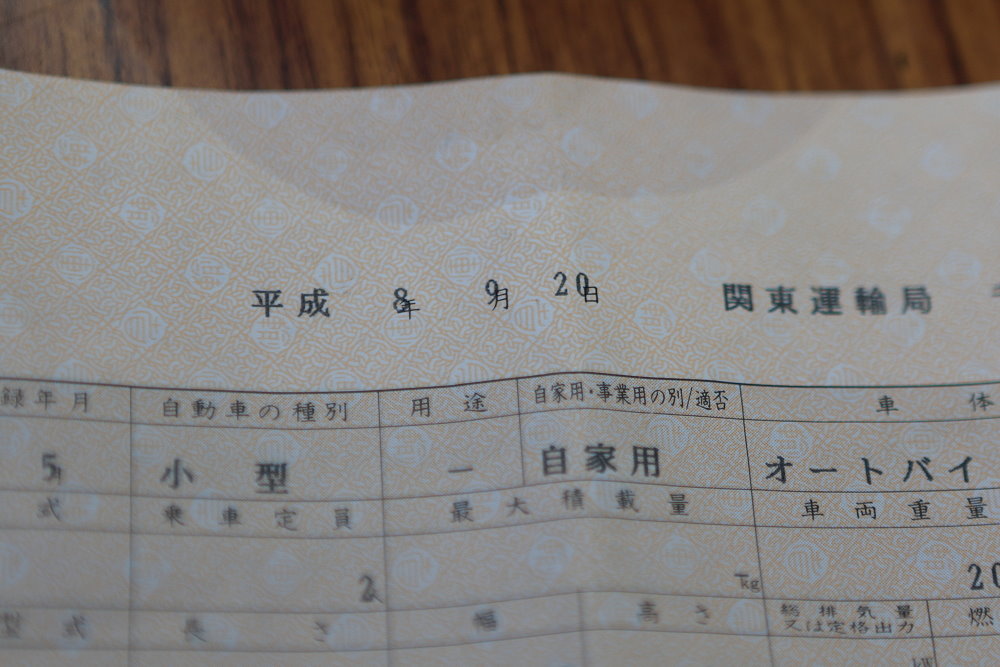 おーこの車検証懐かしいなぁ・・・最後に車検を取ったのいつだコレ?なんて車検所得年月日を確認すると平成8年・・・え?いま平成28年でしょ・・・って20年も昔に車検を取ったのが最後^^: