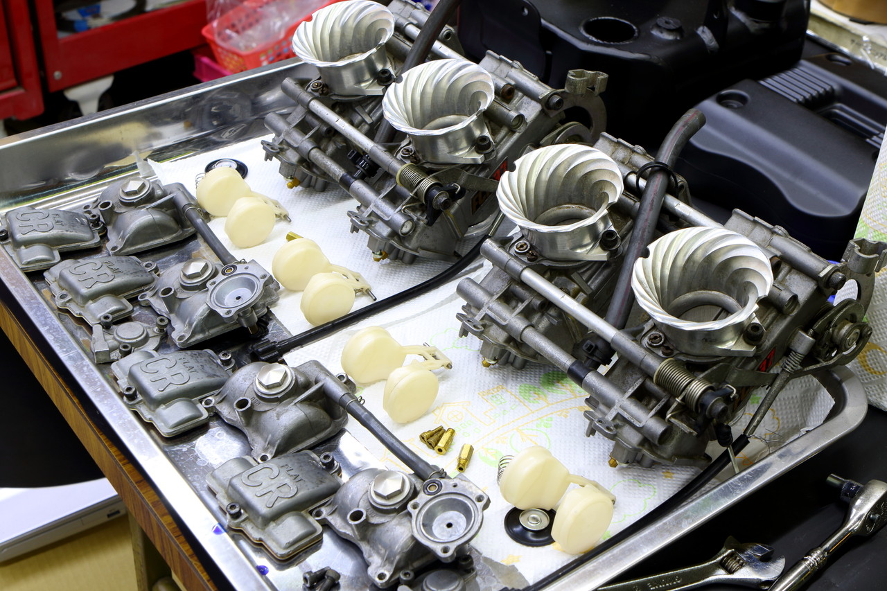 前回V型 E/g のFCRキャブのセッティングをやらせて頂いて非常に楽しかったのですが、よく ” インジェクションだとパソコンを繋げて数字を変えるだけでどんどんセッティング作業が進められるから楽でいいよなぁ・・・ ” なんて言われますが、エアクリ仕様とかだと流石に脱着の手間がアレですけど個人的にはキャブセッティングの方がジェット類などの現物をとっかえひっかえしている分、宝探しをしている感があって楽しいんですよね^^