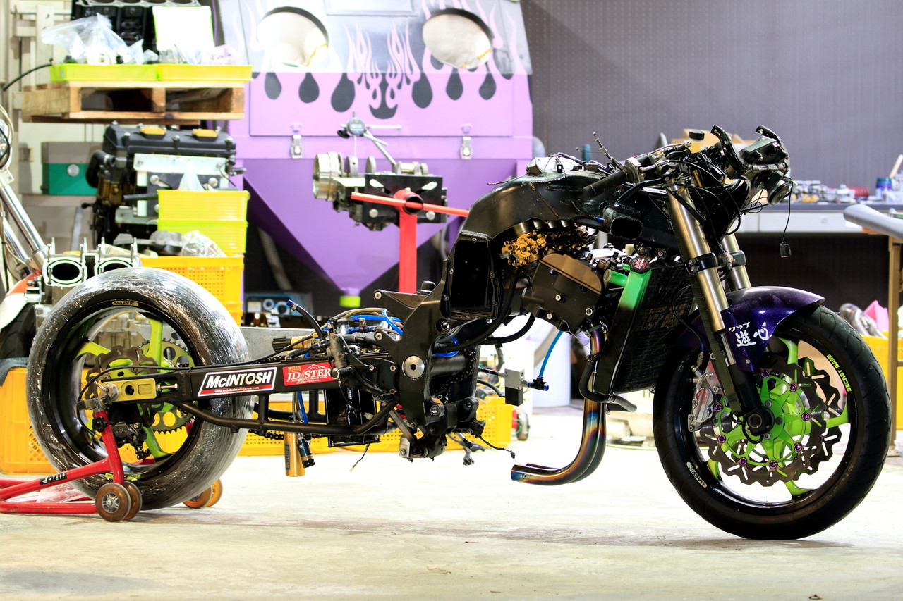 そんな中、SURE SHOT さんのマシンは一体どこにあるのだろうか・・・と人込みで溢れる会場内を探しますが、マシンの搬入前夜にマフラーを納品に行った時にはまだマシンはバラバラで、オリジナルで型から起こしたというカーボン外装の加工などを行っていて原型を留めておらず、これ間に合うのかな?と一瞬脳裏を過ったくらいにバタバタされていたのでもしかしたら間に合わなかったのか・・・と