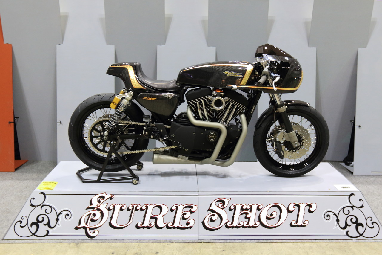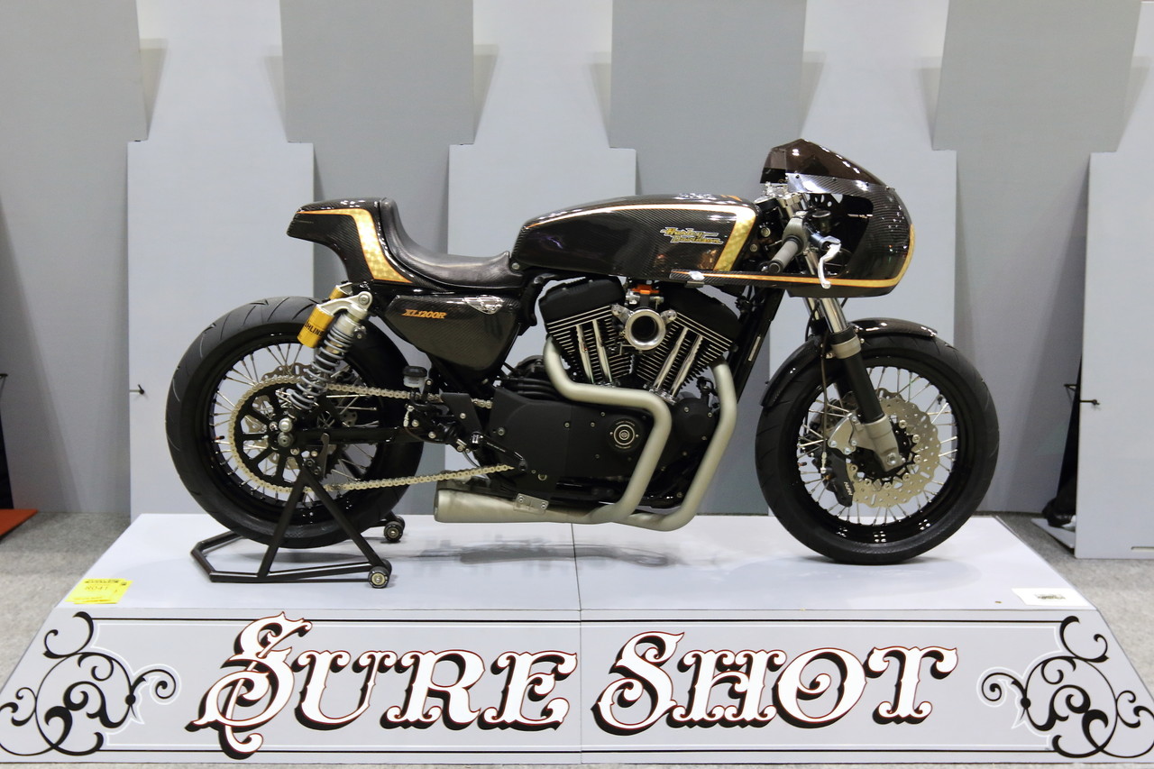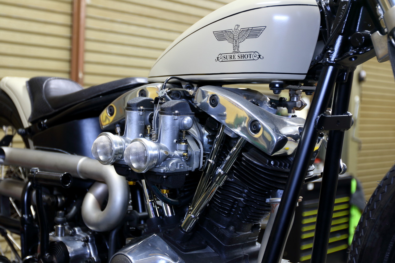 普段のSURE SHOT さんでは古いハーレーのレストアや制作がメインらしいのですが、今回は初の試みで現行に近いモデルをベースにレーサーテイストなマシンを制作していると仰られていたので、この手の古いタイプやチョッパータイプじゃないのだけは分かっているのですが・・やはり間に合わなかったのか・・・。