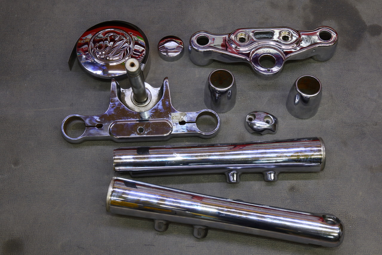 そしてこちらもメッキ仕様からブラックに変更の依頼で昨年の暮れにショーバイクの製作でセラコート処理を担当させていただいた八街のハーレー専門店さんからの依頼品ですが、今回の希望は艶ありブラックとのことで、正直個人的にガンコートやセラコートは元々の仕様が6分艶ですのでウレタンやパウダーコートのような艶ありブラックは苦手というか無理・・・な面がありまして、セラコートだと先ほどの釣具のハンドルに施した艶感がクリアー無しでは最大で、