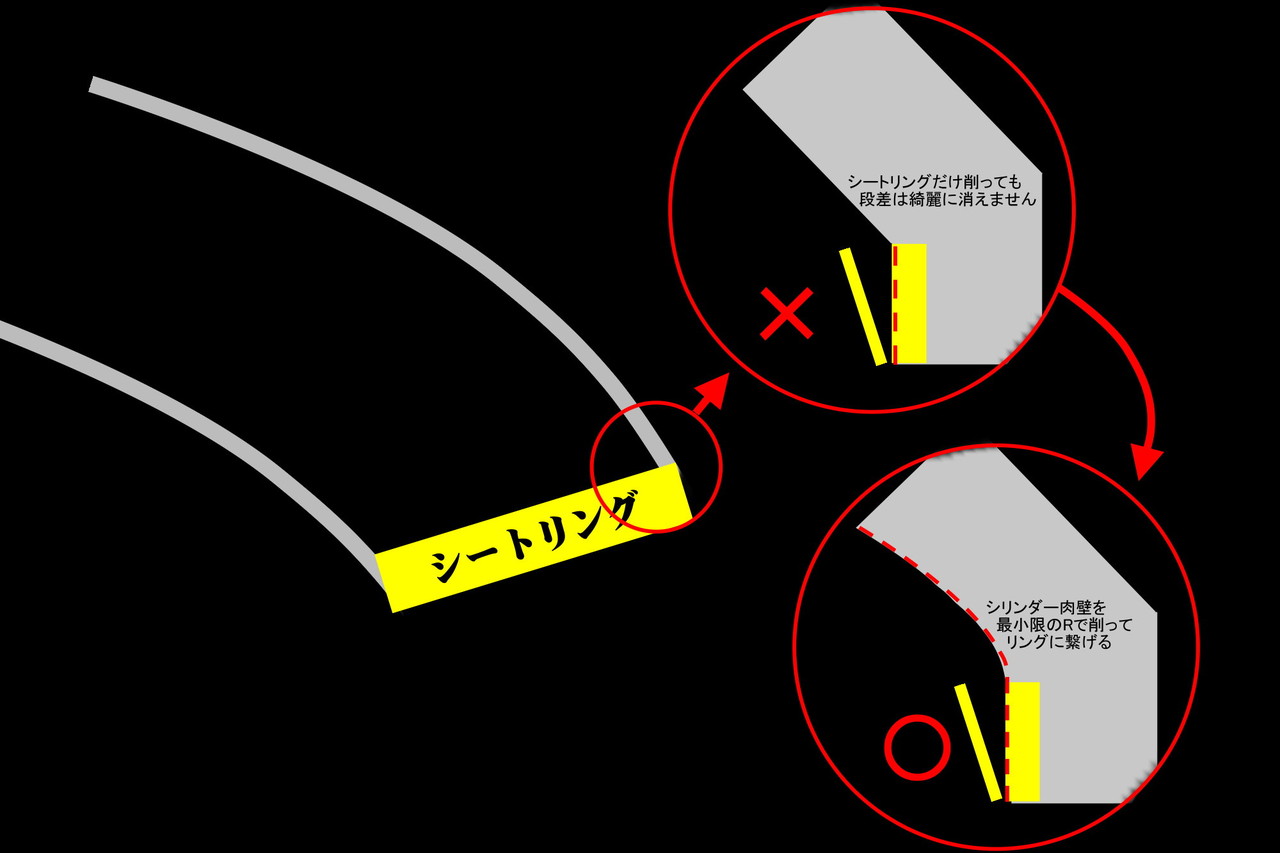 作業の内容的にはリングとシリンダーの繋ぎ目を研磨して繋がり部分で発生する吸排気に於ける流速抵抗などを低減する目的で行いますが、イラストのように単純にリング部分だけを削って繋がりを合わせようとすると結果的に繋がり部分の角度がきつくなり乱流が発生して有効面積が稼げませんので、ポートのスロート(喉)部分以降のポート容積を出来るだけ増やさないように注意しつつ、シリンダー〜リングをRで繋がるように研磨をします。