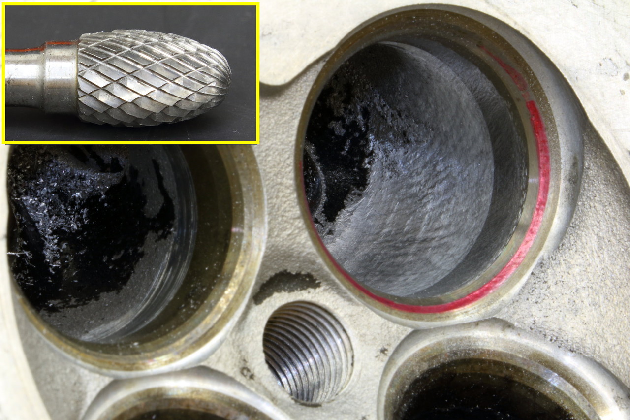 先ほど傷を付けてしまったポートですが、まずは荒削りが得意なスパイラルタイプの超硬バーを使用して大体のポートデザインに仕上げますが、この後、最終仕上げまでにまだまだ研磨を続けて肌質を整えますので、この段階で限界まで削らずにその分の削りシロは残しておきます。