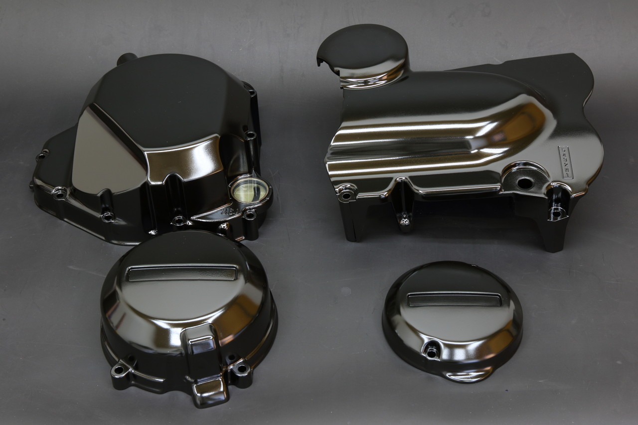 そんな事から以前に同じように艶ありブラックでご依頼をいただいたこちらのエンジンカバー一式はガンコートを選んでいただいて、