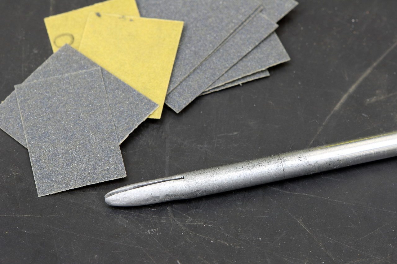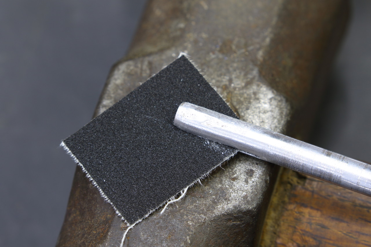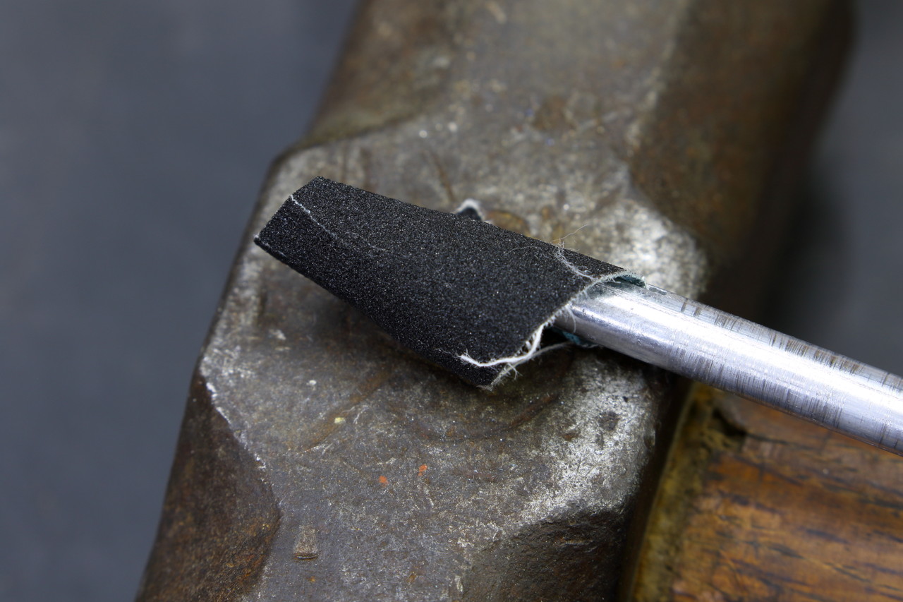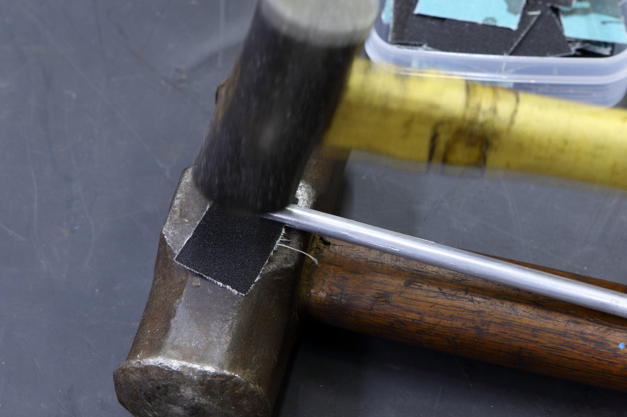 切れ目が入れ終わったらそのままでは隙間が広いので、切れ目にペーパーを挟んで軽くハンマーで叩いてペーパーが落ちない(ペーパーの取替えが出来るように潰し過ぎない)程度に切れ目の隙間を潰します。