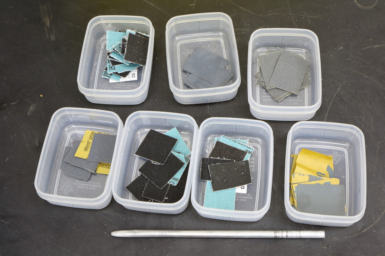 以前までのようにいちいちペーパーをグルグル巻かずに一回分(丸棒一周分)位で適当にペーパーをカットして、研磨力が落ちたら手返し良く次から次へとペーパーを差し替えてチャッチャと進める作戦ですが、ペーパーの付け替え作業に慣れてしまえば効率がかなり良いので作業ペースも以前よりもアップしてだいぶ良くなりました。