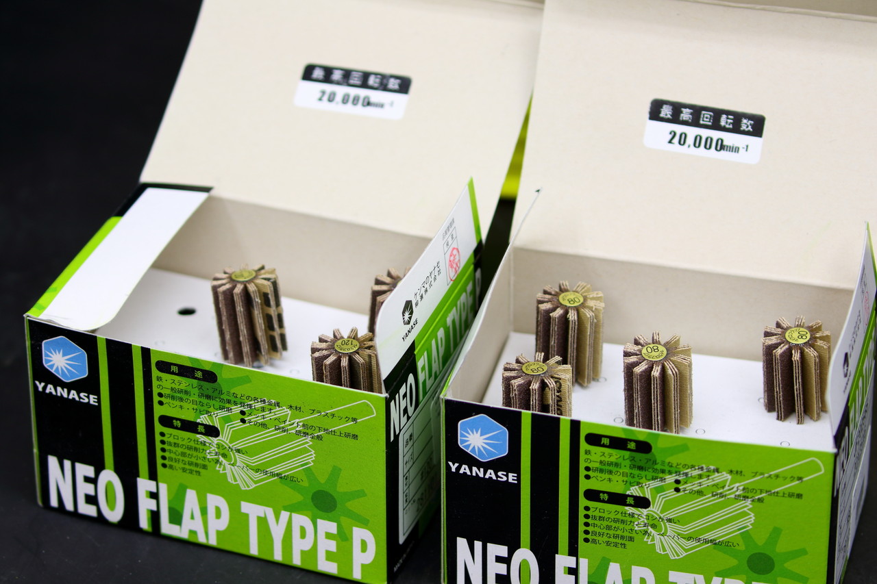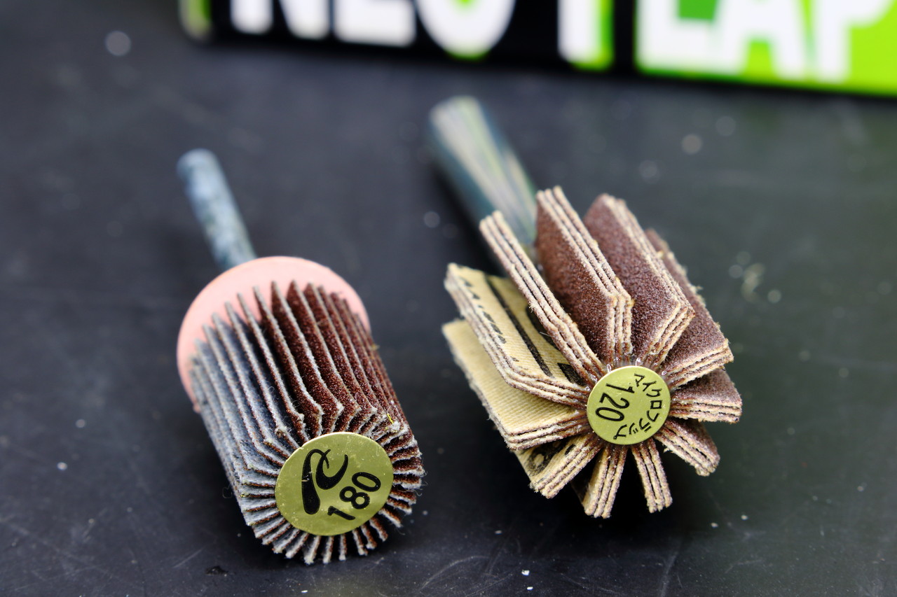 イチグチのマイクロフラップはポート2気筒分を処理したくらいで画像のようにすぐに残念な状態になってしまうのですが、ヤナセのneoフラップシリーズは4バルブの4気筒を処理した後でも画像のような状態で使い勝手がいいので最近はヤナセのフラップホイールを多用しています。