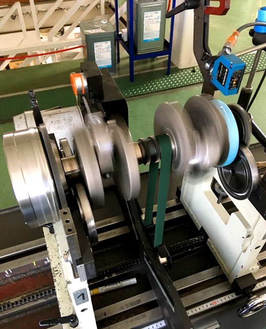 その後、クランクシャフトから取り外せないギアなどの関係でバランスマシンにセットが出来ないという問題が発生してどうするか?で一度作業が中断したのですが、バランスマシン側を改造することで対応していただけるということで巨大なベアリングを用意していただいて、