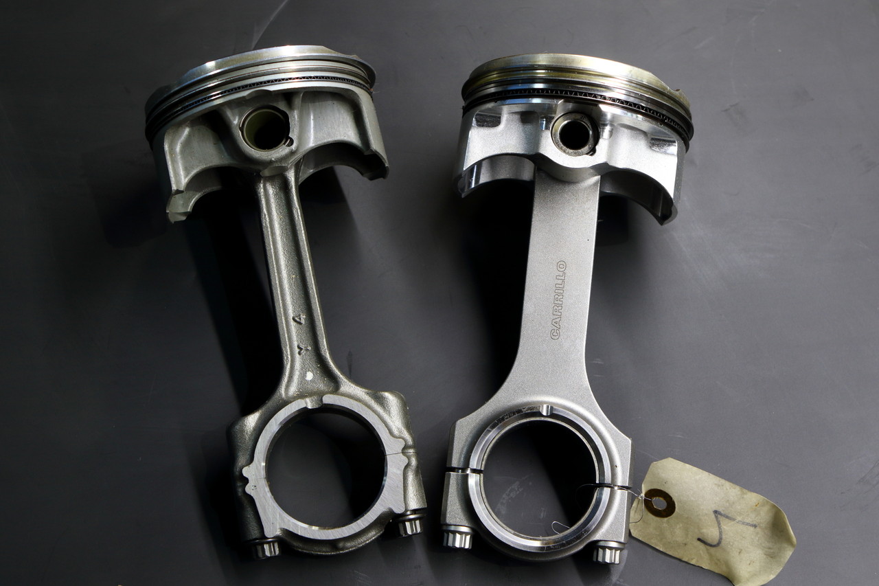 で、今回のV-MAX1700の作業はウチで一から製作する訳ではなく、以前にショップさんで作られたマシンに対するご相談を受けまして、ここでの細かい詳細と内容は避けますがいろいろ問題がお有りとのことで、とりあえずエンジンも一度バラして不良箇所を洗い出しつつ、しっかり組み直しましょう。と分解点検をしたところ、ターボ仕様に合わせてキャリロのHビームとローコンプの鍛造ピストンが組まれていたのですが、
