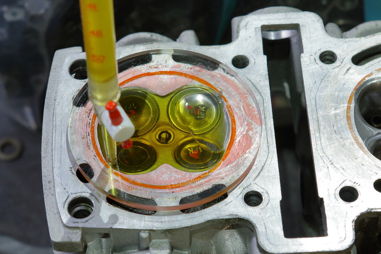 試し彫り用のテストヘッドを使って目標の圧縮比に持っていけるように形を整えつつ、少し削ってはバルブを組み付けて容積を測ってバラして洗浄して、少し削ってはバルブを組み付けて容積を測ってはバラして洗浄して計算して・・・と、