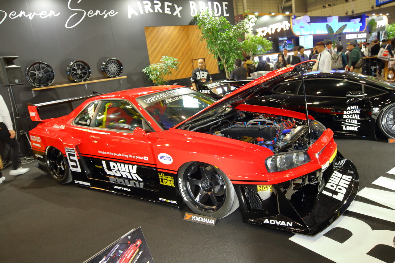 そのLiberty Walkさんが制作してきたER34+L型E/gのスーパーシルエット仕様のSKYLINEが個人的に以前に製作途中で断念したR34の顔面をスワップしてSR20E/gを積んだR32の完成形のイメージがこんな感じだったなぁ・・・と、身近な車種をベースとしていて、発想や纏め方が今回のオートサロンの中で個人的に一番良かったように感じました^^