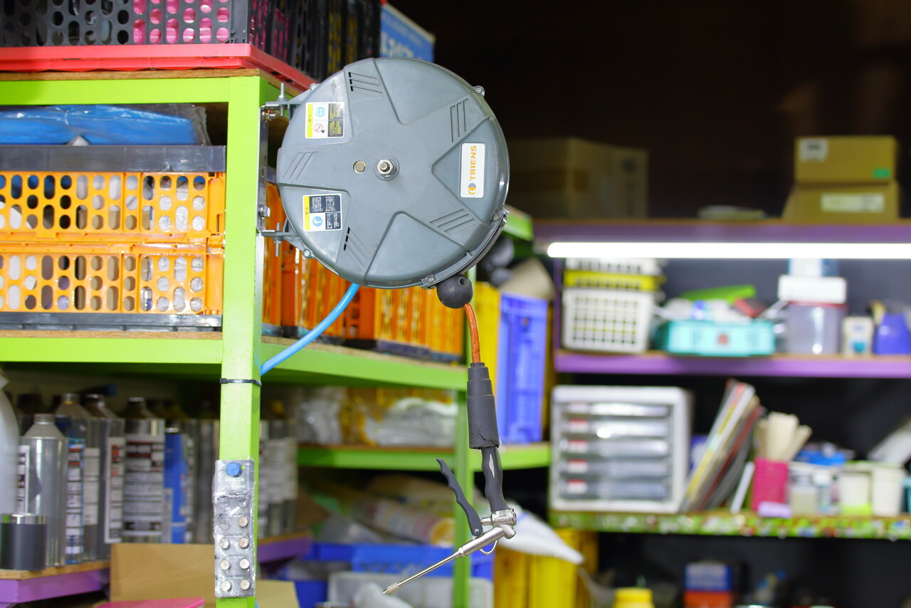 そして作業性や使い勝手を考えて、自分の可動範囲をカバーできるように設置をしますが、やはりリールタイプだと収納が楽でホースに躓いてコケそうになる事もなく、なぜもっと早くに直して使わなかったのか・・と後悔するくらい作業環境が良くなりました^^