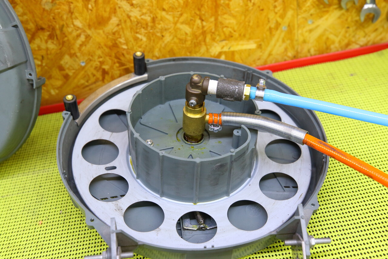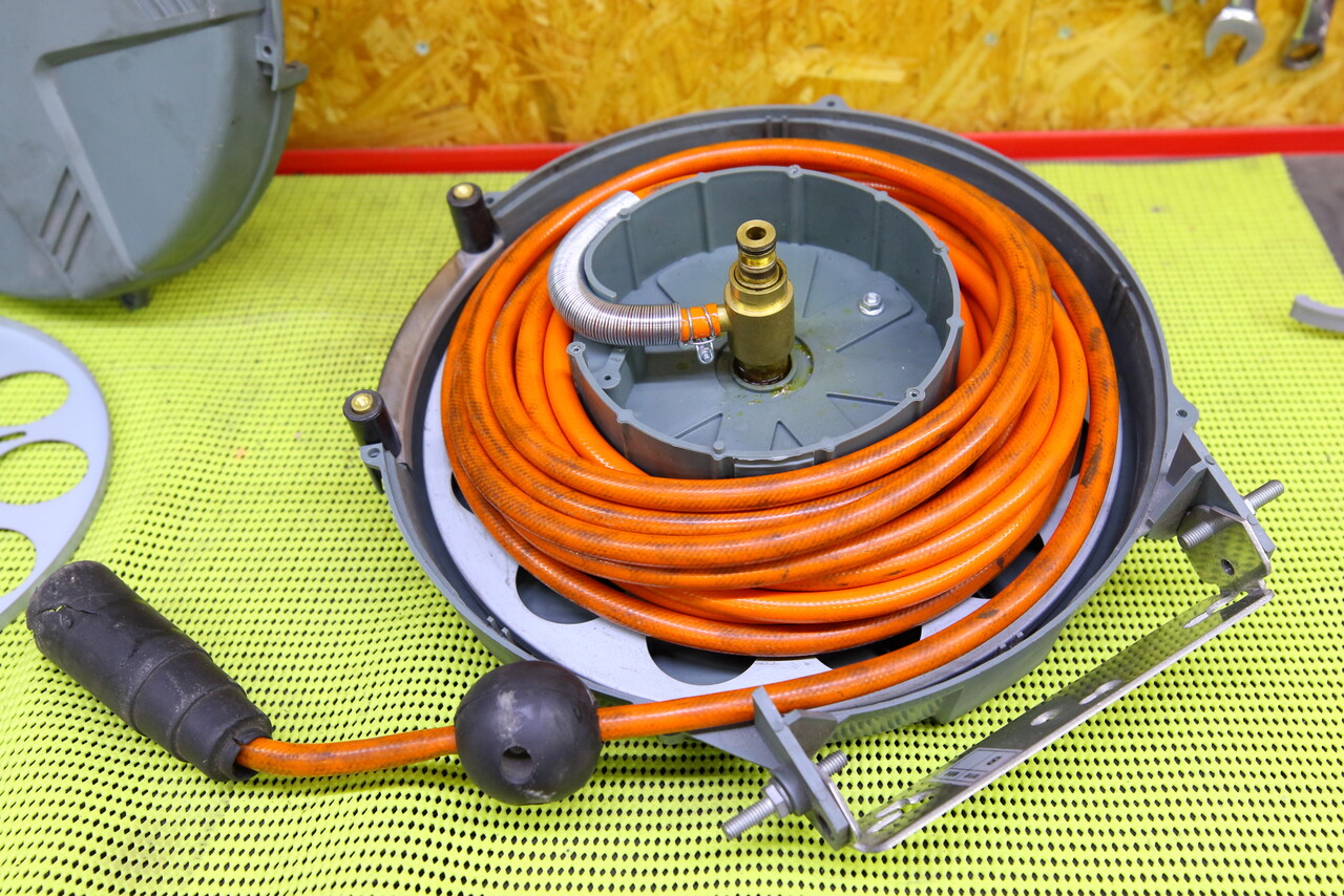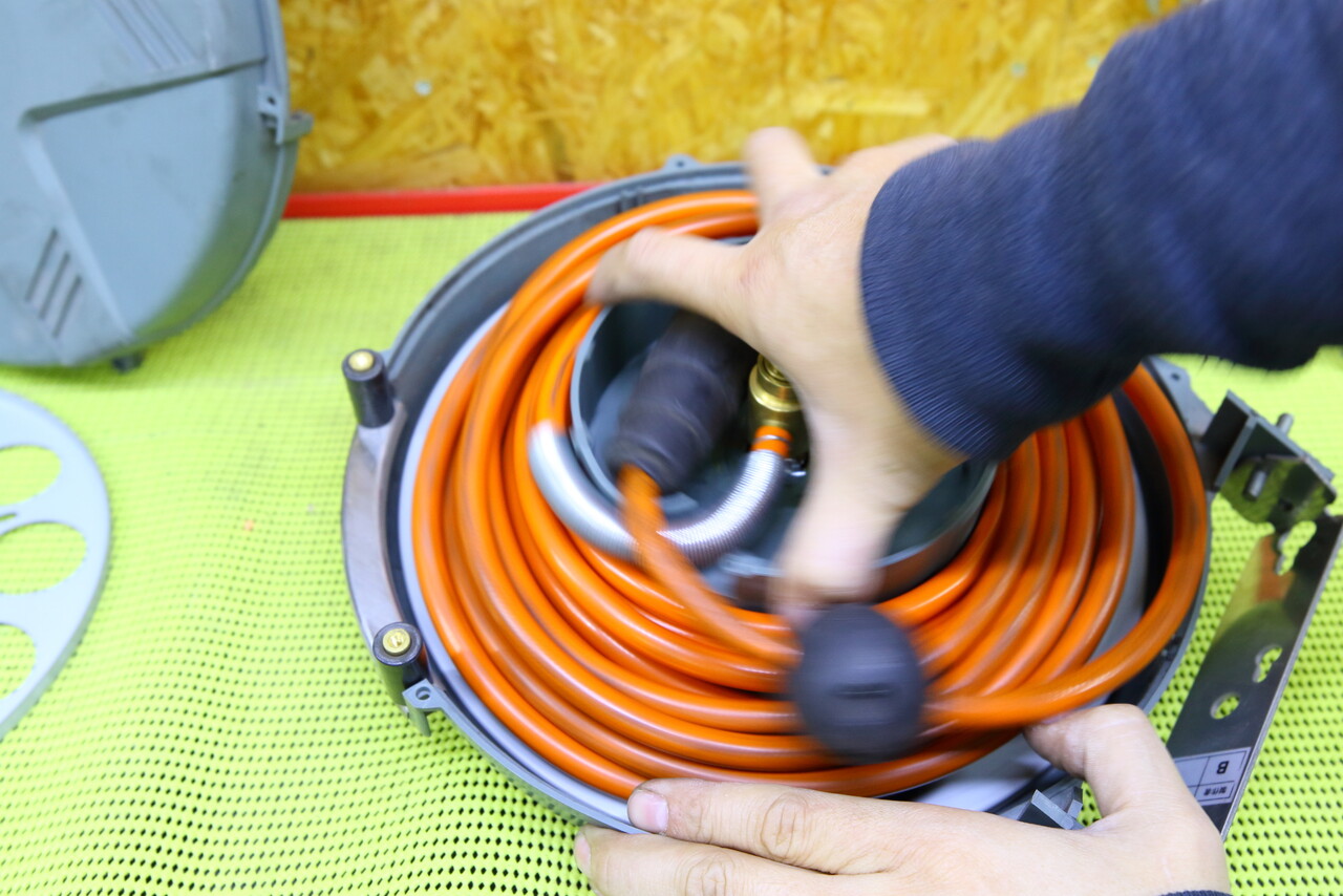 折角なのでホースも新品に変えて長さも増やそうか・・・? と考えたのですが、ホースの状態は弾力もあってまだまだ使える状態なのでそのまま再利用する事にして組み立てですが、まずはホースをリールに巻き付けて、