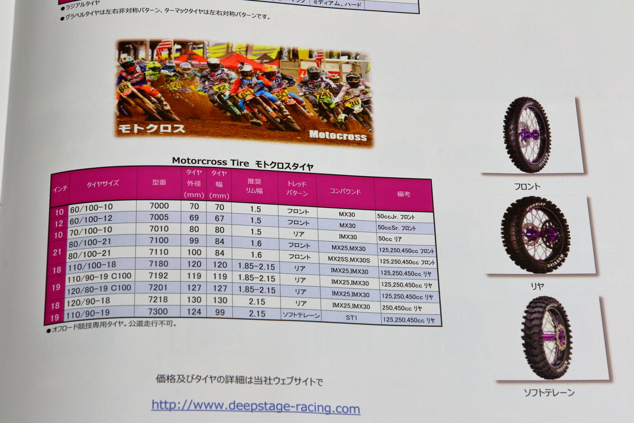 そのHoosier Racing Tireを国内で扱うDEEP STAGEさんから " 誰かモトクロス用のタイヤを使ってくれる人居ないかな? ” との事で、完全なレース用タイヤですので限られた人向けとなりますが、モトクロスでレースをされている方がもしこの記事を見てくれていて、下記URLのカタログのタイヤに興味がお有りでしたら是非 secretbase-racing@nifty.com までご連絡を宜しくお願いいたします^^