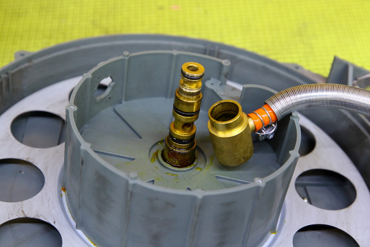 そしてストッパーで巻かれていたバネの力を逃がしてフリーにしてからホースを取り出して軸受け部分のOリングをチェックしてみると、3か所あるOリングの全てが劣化してカチカチに。