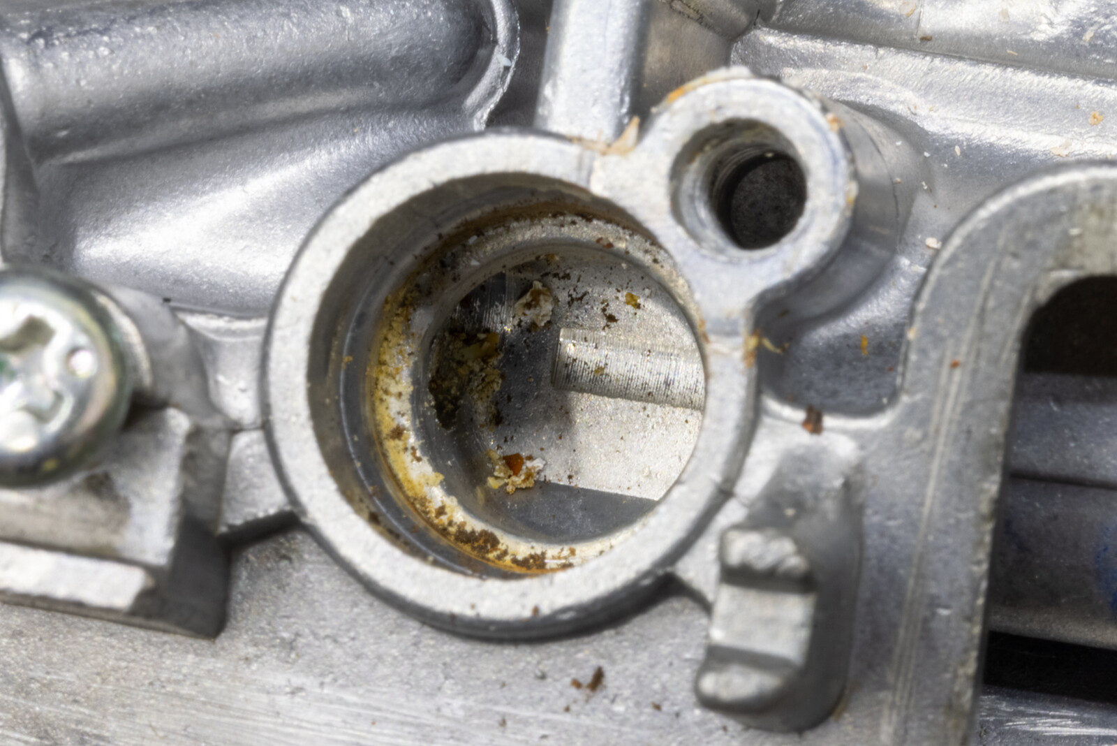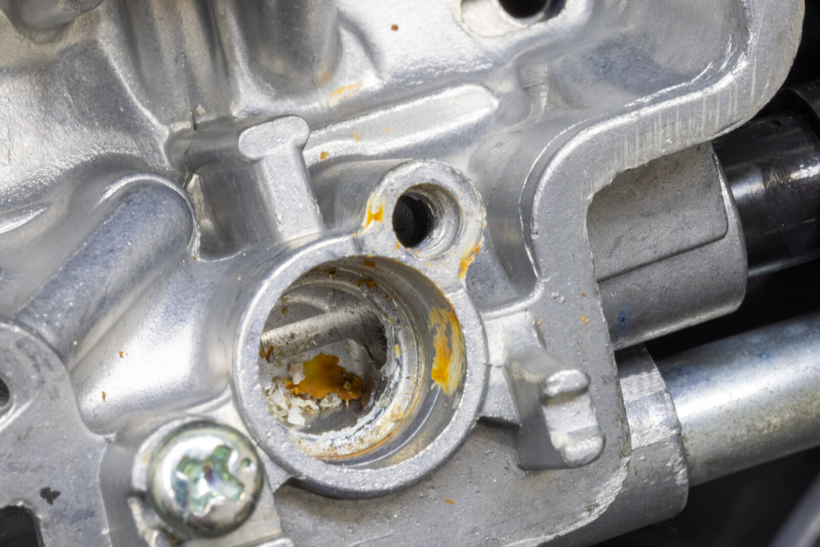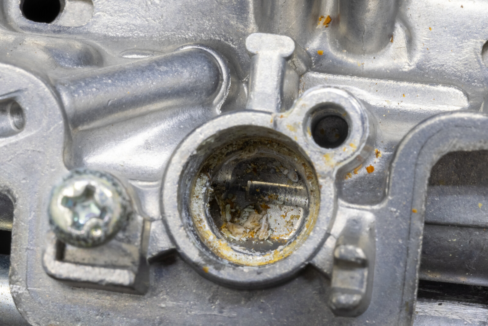 オーバーフローの原因はフロートバルブシートとキャブレターボディ部分の酸化による腐食とガソリンに含有している成分の固形化した物が原因でした。