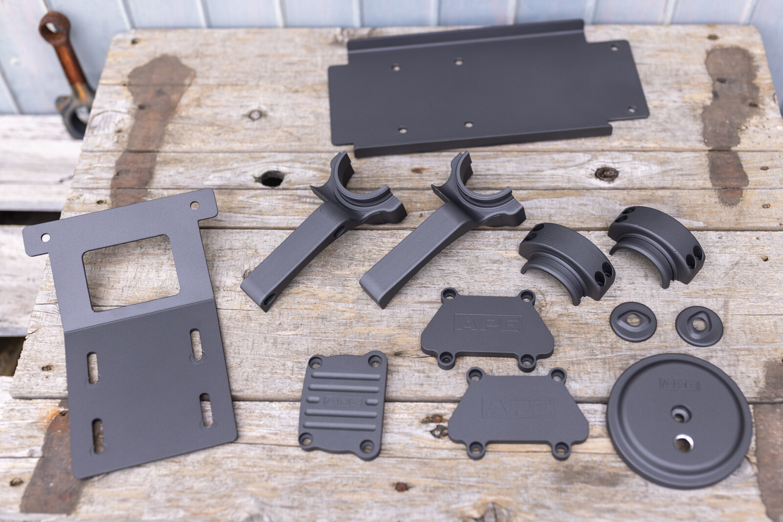 仕上がりがこちらですが、キャリパーの裏側など見えない部分はウェットブラストを当てさせていただき、スイッチホルダーの文字部分にはセラコートで墨入れを行わせていただきました。