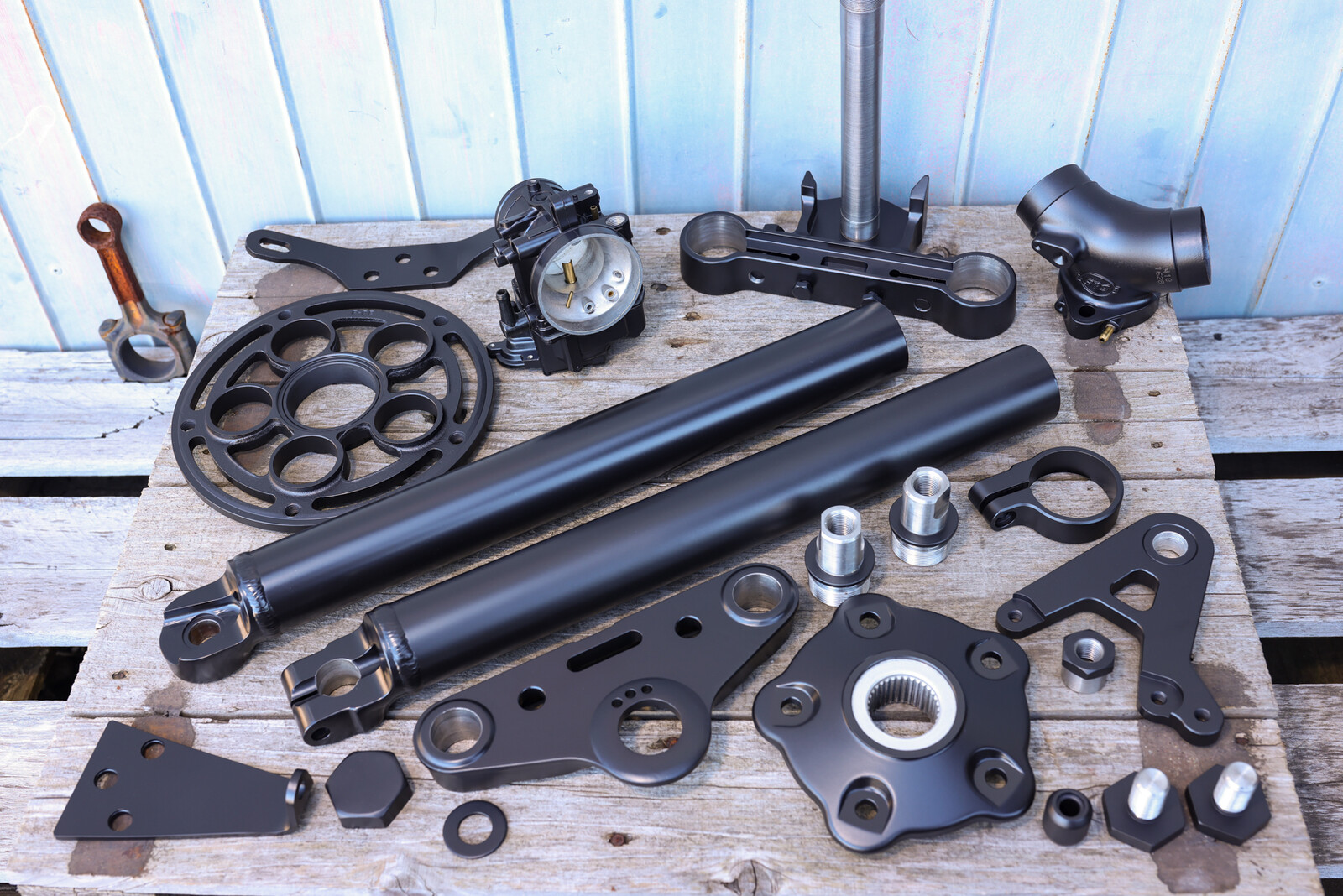 「今年のショーバイクには削り出しのワンオフホイールを製作してドゥカティの片持ちスイングアームなどを使ってまた面白いのを作りますよ」と聞いていたのですが、この送られてくる部品達を見てどのような仕上がりになるのか全く予想が出来ないので、毎年当日に会場で完成形を見るのが本当に楽しみでなりません^^