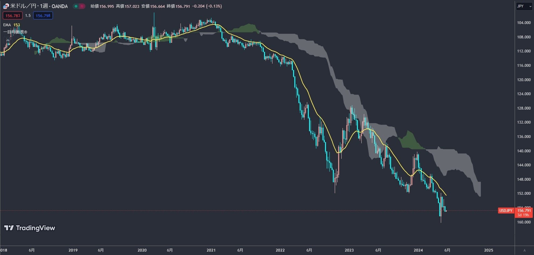ドル円の為替が2年近く掛けて形成された週足のアセンディングトライアングルを大方の想定通りに上抜けして青天井になってしまいましたね。