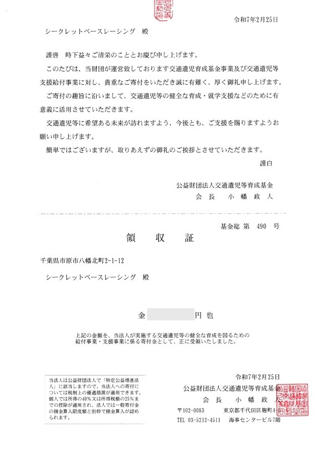 様に昨年シークレットベースレーシングを利用して頂いた皆さんを代表して僅かばかりのお気持ちを支援させていただきました。
