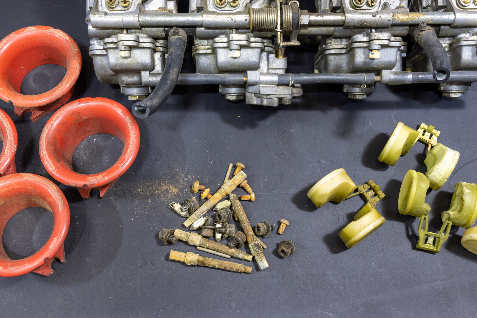 年に何回かあるトラブル例としまして、キャブレターのオーバーホールのご依頼を頂いて、殆ど朽ち果てたようなキャブレターの分解チェック後に見積りを提示すると、事前にお問い合わせ時に提示した概算見積りと同程度の金額にも関わらず『その金額なら作業は頼まない、元の状態に戻して返して欲しい』と言われる事があります。しかし、画像のように朽ち果てたボロボロの状態ではOリングなどが不可逆的に再利用できず、元に戻せないことを伝えると、『それは聞いていない、元々使える状態だったので使える状態にして返せ』といったケースが数回あり、チェックの為に分解した場合に未作業の際には部品が再利用出来ず元の状態に戻せないリスクがあることを伝えれていなかったこちらが悪かったなと凹んだ事があったり、