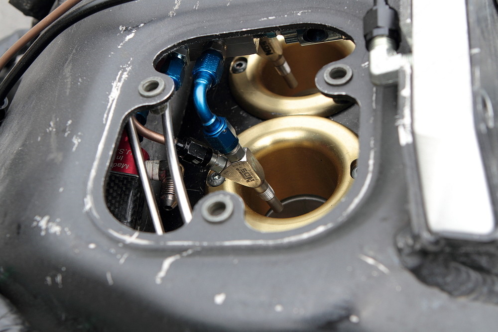 そして吸気の流れを邪魔をしないようにファンネルから離す吊り下げ式で、前回の仕様と異なり、高圧ガスの噴射時の圧力を利用して燃焼室側により多くの混合気を送り込むことを狙いとし、NOSの仕様変更におけるジェットの組み換えも所要時間20分程度、プラグ交換も15分程度と、以前までの半日か丸一日作業に比べてそれぞれの整備性でも大幅に改善することが出来ましたので、レース中の仕様変更も容易になりました^^