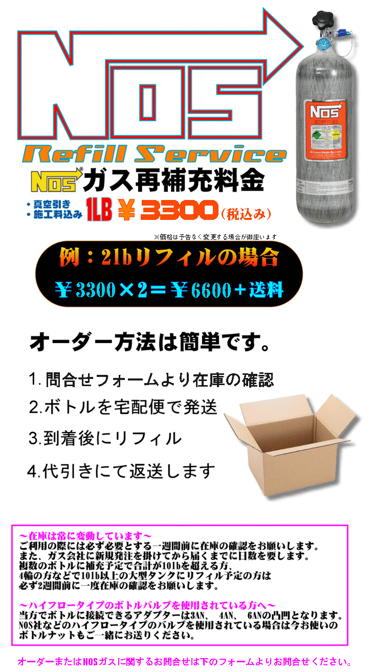 また、当ガレージにおいてのNOSガス(亜酸化窒素)の取り扱いに際しては旧来どおり専用のボンベ以外へのリフィル等は一切行いませんので予めご了承ください。