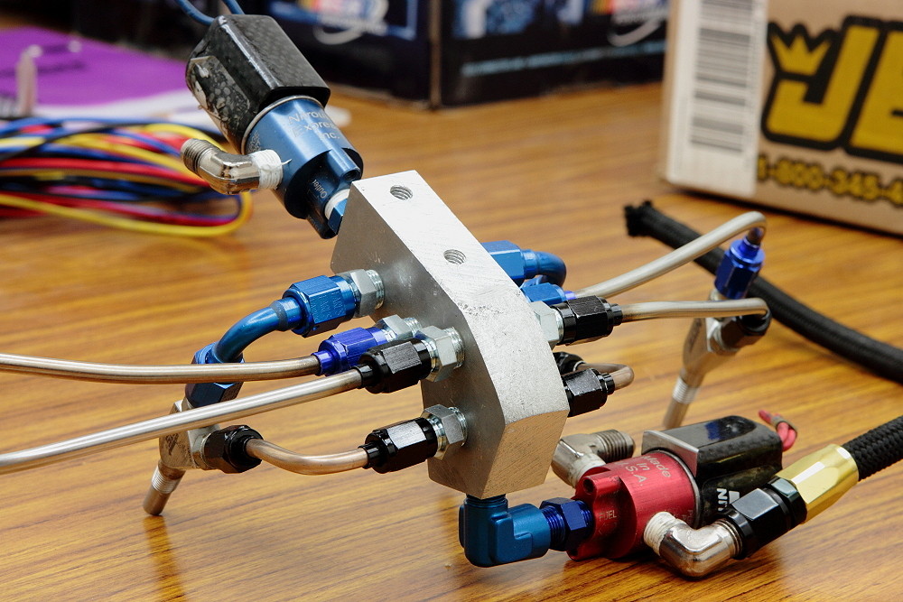 とにかく毎度毎度12Rは独特なモノコックフレームのお陰でスペースが狭く、燃料とN2Oガスのそれぞれにソレノイドバルブや配管を設置すると只でさえ最悪なスペースが極悪な状況になってしまい、ジェットの仕様変更をするにも数時間を要す有様で、個々に部品点数が多いので細々としたトラブルを抱えるリスクも大きくなってしまったりで、やっぱりシンプルなドライNOS仕様の方が機械的にも扱い易くて良かったかも?と考えてインジェクターの大容量化を目論んだ訳ですが、