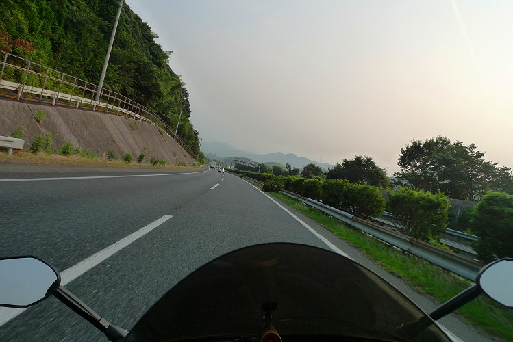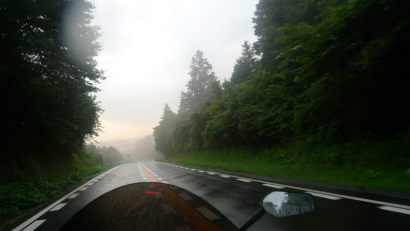 そして日暮れを目前にして大粒の雨が降りだし、この後カメラも出せないくらいの激しい豪雨に見舞われ、定期的に訪れる追い越し区間で前の車を抜こうとアクセルを開けてもリアがグリップせずにテールが横に流れるだけで前に進まず「前後レーシングタイヤでこの豪雨はちょっとキツイな・・・。」ということで・・・